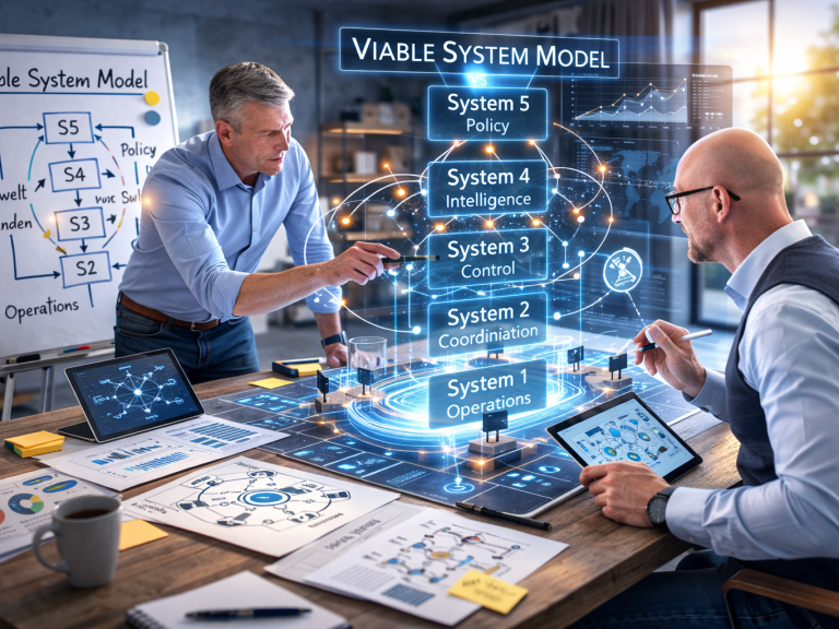 Das Viable System Model nach Stafford Beer zeigt, wie Organisationen so gestaltet werden können, dass sie dauerhaft handlungsfähig bleiben. Es macht sichtbar, wie operative Einheiten, Steuerung und strategische Zukunftssicherung miteinander verbunden sind. Dadurch entsteht Klarheit über Rollen, Entscheidungswege und notwendige Kommunikationsstrukturen. Gleichzeitig werden Schwächen in Koordination, Führung und Anpassungsfähigkeit frühzeitig erkennbar.